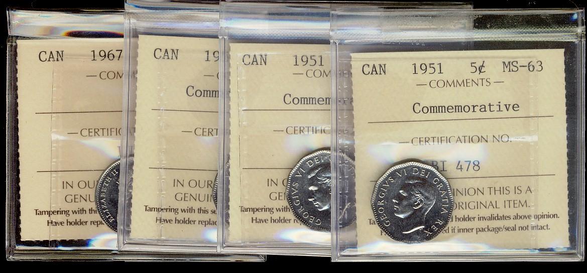 1951 Comm 5¢ MS63, MS65 (2) and 1967 MS64. Lot of 4 coins all ICCS graded.