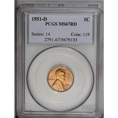 <B>1951-D<1C> MS67 Red PCGS.</B></I> A lustrous orange-red Superb Gem. Boldly struck, and flawless except for a few tiny gray flecks above ONE. Population: 58 in 67 Red, 0 finer (7/06).<BR><I>From The Tigard Oregon Small Cent Collection.</B></I>