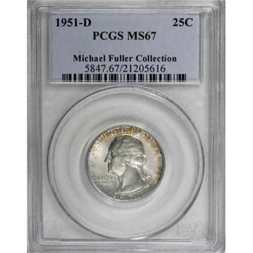 <B>1951-D 25C MS67 PCGS.</B></I> Russet-gold patina is noted near the obverse rims, but only a few small crescents of color are present on the other side. Suitably struck with strong luster. Population: 15 in 67, 0 finer (10/07). <BR><I>From The Michael Fuller Collection.</B></I><BR><BR><B>Coin Engraver:</B> John Flanagan<BR><BR><b>Shipping:</b> Coins & Currency (<a target="_blank" href="http://www.heritageauctions.com/common/shipping.php">view shipping information</a>)