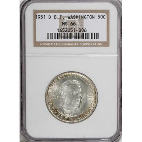 <B>1951-D 50C Booker T. Washington MS66 NGC.</B></I> NGC Census: (163/21). PCGS Population (151/6). Mintage: 7,004. Numismedia Wsl. Price for NGC/PCGS coin in MS66: $252. (#9425)<BR><BR><b>Shipping:</b> Coins & Currency (<a target="_blank" href="http://www.heritageauctions.com/common/shipping.php">view shipping information</a>)