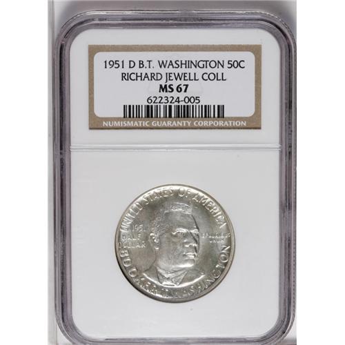 <B>1951-D<50C> Booker T. Washington MS67 NGC.</B></I> Ex: Richard Jewell Collection. This low mintage Superb Gem is faintly toned peach and powder-blue. Otherwise, this satiny beauty is as made, with only inconsequential planchet chatter present on the portrait. Census: 18 in 67, 0 finer (8/06).