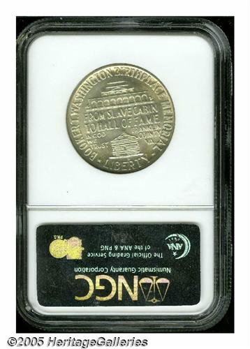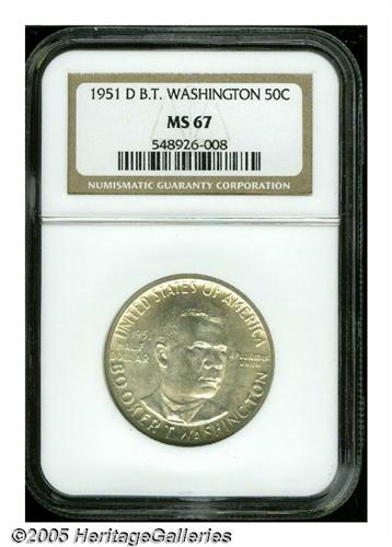 <B>1951-D<50C> Booker T. Washington MS67 NGC.</B></I> Light lime color graces the unabraded satin surfaces. The strike is undeniably above average, a few faint marks present on the planchet prior to the strike are found on Washington's jaw, a characteristic of all examples of the type. A scant 7,004 pieces were struck, the extra four coins destined for assay.