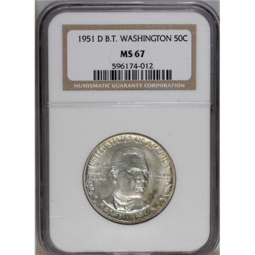 <B>1951-D<50C> Booker T. Washington MS67 NGC.</B></I> The seemingly pristine surfaces are well struck and fully lustrous. This is a conditionally scarce coin as a Superb Gem, and none have been graded any higher by NGC. Census: 19 in 67, 0 finer (7/06).