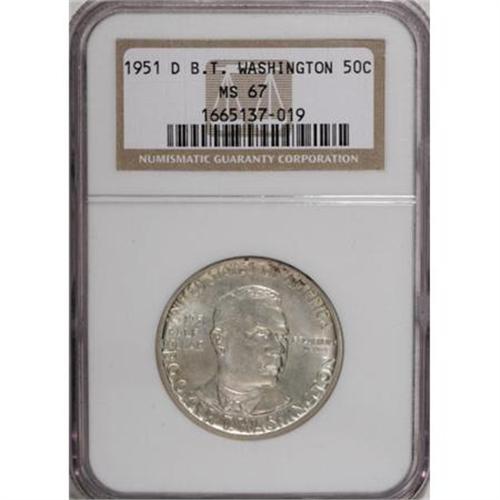 <B>1951-D 50C Booker T. Washington MS67 NGC.</B></I> While readily available in lower grades, a Superb Gem example of this issue is a condition rarity. This piece has sparkling luster and is largely untoned with no distractions of any note. One of just 7,004 pieces struck for this issue, one of the last for the design. Neither NGC nor PCGS has certified an MS68 or better coin (1/08).<BR><BR><b>Shipping:</b> Coins & Currency (<a target="_blank" href="http://www.heritageauctions.com/common/shipping.php">view shipping information</a>)