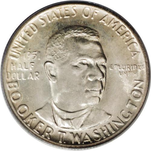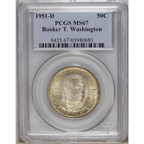 <B>1951-D 50C Booker T. Washington MS67 PCGS.</B></I> Sharply struck and exquisitely preserved, with gleaming satiny luster and the absence of any distracting blemishes or problems. This Superb Gem betrays a slight degree of gold and peach patina that makes itself most noticeable near the peripheries.<BR><BR><b>Shipping:</b> Coins & Currency (<a target="_blank" href="http://www.heritageauctions.com/common/shipping.php">view shipping information</a>)