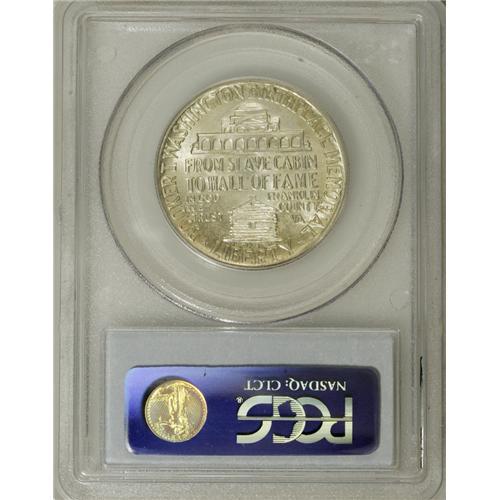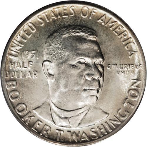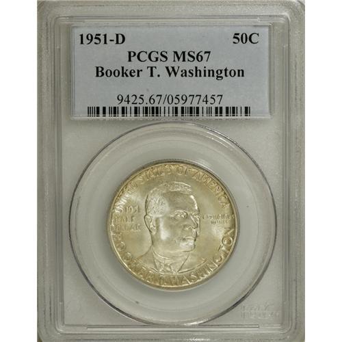 <B>1951-D 50C Booker T. Washington MS67 PCGS.</B></I> This Superb Gem is an important item. The mintage of just 7,004 coins confirms that the date is important, and the minimal population indicates the conditional rarity at this grade level. Fully lustrous surfaces are graced by pale gold toning. Population: 5 in 67, 0 finer (1/07).<BR><BR><b>Shipping:</b> Coins & Currency (<a target="_blank" href="http://www.heritageauctions.com/common/shipping.php">view shipping information</a>)