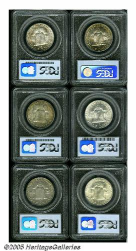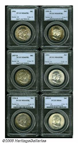 <B>1951-D<50C> MS65 Full Bell Lines PCGS,</B></I> splotches of red, yellow and blue color, some tiny marks noted in the right obverse field; <B>1953 MS65 Full Bell Lines PCGS,</B></I> well preserved, lustrous and appealing; <B>1953-S MS66 PCGS,</B></I> light golden, matte-lustrous surfaces, <B>1956 MS66 Full Bell Lines PCGS,</B></I> speckled russet on light blue surfaces, a few small marks, very minor; <B>1957-D MS66 Full Bell Lines PCGS,</B></I> orange and green tonality, brighter at the peripheries, well struck; and a <B>1958-D MS66 Full Bell Lines PCGS,</B></I> speckled rainbow color, fading to light blue on the reverse, and with just a few light imperfections visible on the bell.<BR><I>From The Southern Collection.</B></I>