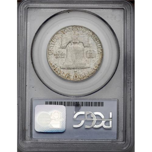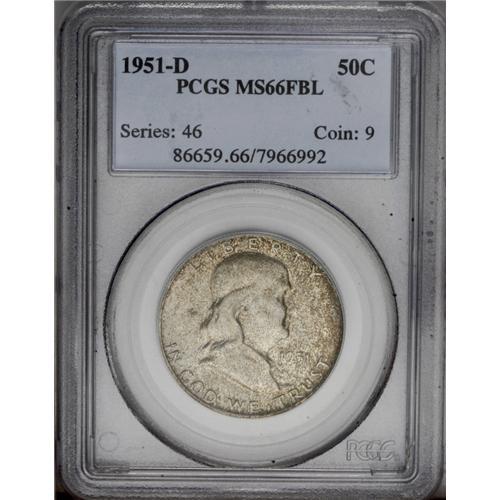 <B>1951-D<50C> MS66 Full Bell Lines PCGS.</B></I> There is not a single '51-D Franklin half dollar certified finer than MS66 Full Bell Lines at either NGC or PCGS (3/06). One of 57 examples so graded at the latter service, this richly frosted and fully brought up survivor possesses undeniable originality. Freckled orange-russet toning drifts toward the borders with more even slate-gray shades underlying. The distraction-free features are uncommonly well preserved for this often noticeably abraded type.<BR><I>From The Alex & Nan Registry Sets.</B></I> <BR><BR><B>Important notice:</B> Heritage usually auctions material at the rate of 200-250 lots per hour. On some occasions eBay Live bid software or the Internet may not be able to keep up with the pace of the auction. We recommend placing a realistic absentee bid now as insurance to avoid disappointment. Occasionally the auctioneer may eliminate or reject an eBay Live bid, and the auctioneer may also reopen a lot after the close of the eBay live bidding (usually because we missed an audience bid), and may reject your bid even if it shows you as the winning bidder. By bidding via eBay Live, you agree that Heritage may award the lot to another bidder at its sole discretion under the circumstances described above or any other reasonable circumstances. Since eBay bids are not shown to us until we open the lot on the floor, we treat those bids just like floor bids. In most cases the floor responds before the eBay bid is presented to us, due to Internet lag time, so for consistency we have made it a policy that floor bids are always considered first over tie eBay live bids. Also please note that all Heritage lots purchased through eBay Live carry a 20% Buyer's Premium. Please make sure you read the Terms and Conditions before you bid. This lot is being auctioned in conjunction with a live floor auction by Heritage Galleries & Auctioneers. All final auction and invoice information will be supplied by Heritage Galleries & Auctioneers, and all other information should be considered preliminary. Lot:3093 <BR><BR><B>Winning Notification and Billing:</B> After the FINAL session in this auction is complete, Heritage will send e-mail and snail mail invoices. This process normally takes several days. All final auction and invoice information will be supplied by Heritage Galleries & Auctioneers, and all other information should be considered preliminary. <BR><BR>This auction will be conducted on a live auction floor and over the Internet through eBay Live. If you choose to place an absentee bid, please take a moment to <font color='#0000ff'><u><a href='http://pages.ebay.com/liveauctions/help/before/laabsentee.html'>learn how eBay Live absentee bidding works</a></u></font><font color='#000000'>
