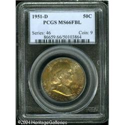 1951-D 50C MS66 Full Bell Lines PCGS. Well struck <B>1951-D 50C MS66 Full Bell Lines PCGS.</B></I> Well struck with exceedingly vibrant luster, a rich coating of multicolored patina on the obverse, and attractive speckled peripheral toning on the reverse. Carefully preserved, with a handful of small marks on the central devices of both obverse and reverse. Population: 48 in MS66 Full Bell Lines, 0 finer (11/04). <BR><BR><B>Important notice:</B> Heritage usually auctions material at the rate of 200-250 lots per hour. On some occasions eBay Live bid software or the Internet may not be able to keep up with the pace of the auction. We recommend placing a realistic absentee bid now as insurance to avoid disappointment. Occasionally the auctioneer may eliminate or reject an eBay Live bid, and the auctioneer may also reopen a lot after the close of the eBay live bidding (usually because we missed an audience bid), and may reject your bid even if it shows you as the winning bidder. By bidding via eBay Live, you agree that Heritage may award the lot to another bidder at its sole discretion under the circumstances described above or any other reasonable circumstances. Since eBay bids are not shown to us until we open the lot on the floor, we treat those bids just like floor bids. In most cases the floor responds before the eBay bid is presented to us, due to Internet lag time, so for consistency we have made it a policy that floor bids are always considered first over tie eBay live bids. Also please note that all Heritage lots purchased through eBay Live carry a 20% Buyer's Premium. Please make sure you read the Terms and Conditions before you bid. This lot is being auctioned in conjunction with a live floor auction by Heritage Galleries & Auctioneers. All final auction and invoice information will be supplied by Heritage Galleries & Auctioneers, and all other information should be considered preliminary. Lot:6319