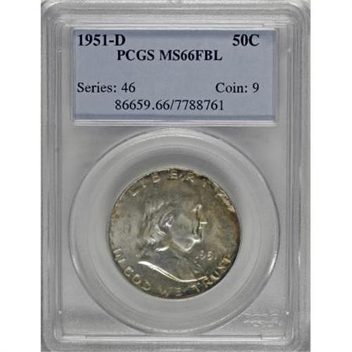<B>1951-D 50C MS66 Full Bell Lines PCGS.</B></I> Some deep, multicolored toning is seen at portions of the border areas. Sharply defined with a couple of small milling marks on the Liberty Bell. Both sides are awash in dazzling luster. Population: 62 in 66 Full Bell Lines, 0 finer (9/07).<BR><BR><b>Shipping:</b> Coins & Currency (<a target="_blank" href="http://www.heritageauctions.com/common/shipping.php">view shipping information</a>)