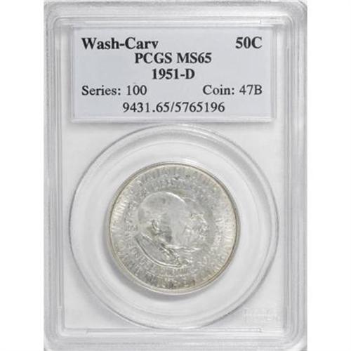 <B>1951-D 50C Washington-Carver MS65 PCGS.</B></I> PCGS Population (305/45). NGC Census: (225/23). Mintage: 10,004. Numismedia Wsl. Price for NGC/PCGS coin in MS65: $132. (#9431)<BR><I>From The Frank DuVall Collection of U.S. Commemoratives.</B></I><BR><BR><b>Shipping:</b> Coins & Currency (<a target="_blank" href="http://www.heritageauctions.com/common/shipping.php">view shipping information</a>)