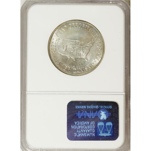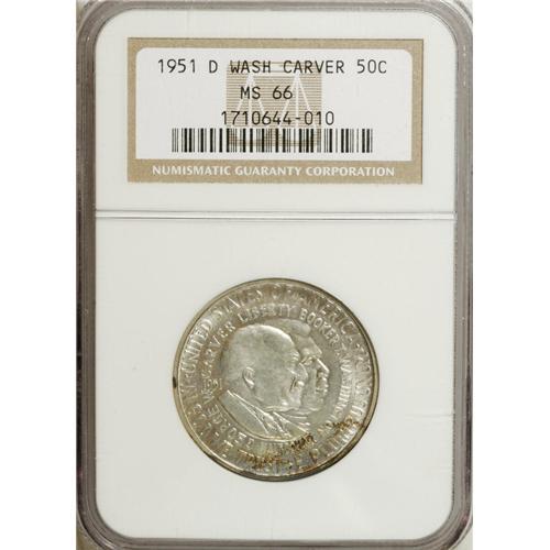 <B>1951-D 50C Washington-Carver MS66 NGC.</B></I> Sharply struck and satiny with slight amber rim toning near the lower obverse and pastel blue and yellow patina over the remainder of the piece. As part of a three-coin set, the 1951-D Washington-Carver half was the second commemorative design distributed by Dr. S.J. Phillips. NGC has graded only one Superb Gem, and PCGS has certified no finer examples (4/07).<BR><I>From The Cary & Cheryl Porter Collection.</B></I><BR><BR><b>Shipping:</b> Coins & Currency (<a target="_blank" href="http://www.heritageauctions.com/common/shipping.php">view shipping information</a>)