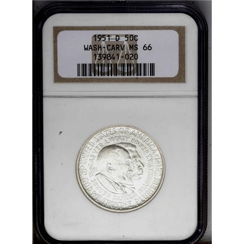 <B>1951-D<50C> Washington-Carver MS66 NGC.</B></I> Silver-gray surfaces are imbued with traces of ice-blue and faint tan, and display nice luster. Sharply struck design elements abound throughout. A handful of light marks on the foreground portrait are mentioned for accuracy. Census: 22 in 66, 1 finer (3/06). <BR><BR><B>Important notice:</B> Heritage usually auctions material at the rate of 200-250 lots per hour. On some occasions eBay Live bid software or the Internet may not be able to keep up with the pace of the auction. We recommend placing a realistic absentee bid now as insurance to avoid disappointment. Occasionally the auctioneer may eliminate or reject an eBay Live bid, and the auctioneer may also reopen a lot after the close of the eBay live bidding (usually because we missed an audience bid), and may reject your bid even if it shows you as the winning bidder. By bidding via eBay Live, you agree that Heritage may award the lot to another bidder at its sole discretion under the circumstances described above or any other reasonable circumstances. Since eBay bids are not shown to us until we open the lot on the floor, we treat those bids just like floor bids. In most cases the floor responds before the eBay bid is presented to us, due to Internet lag time, so for consistency we have made it a policy that floor bids are always considered first over tie eBay live bids. Also please note that all Heritage lots purchased through eBay Live carry a 20% Buyer's Premium. Please make sure you read the Terms and Conditions before you bid. This lot is being auctioned in conjunction with a live floor auction by Heritage Galleries & Auctioneers. All final auction and invoice information will be supplied by Heritage Galleries & Auctioneers, and all other information should be considered preliminary. Lot:5129 <BR><BR><B>Winning Notification and Billing:</B> After the FINAL session in this auction is complete, Heritage will send e-mail and snail mail invoices. This process normally takes several days. All final auction and invoice information will be supplied by Heritage Galleries & Auctioneers, and all other information should be considered preliminary. <BR><BR>This auction will be conducted on a live auction floor and over the Internet through eBay Live. If you choose to place an absentee bid, please take a moment to <font color='#0000ff'><u><a href='http://pages.ebay.com/liveauctions/help/before/laabsentee.html'>learn how eBay Live absentee bidding works</a></u></font><font color='#000000'>