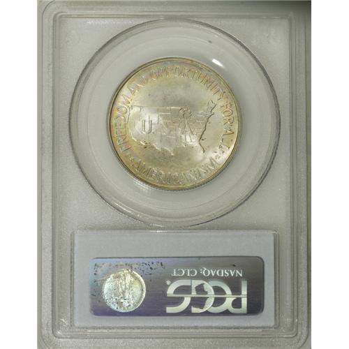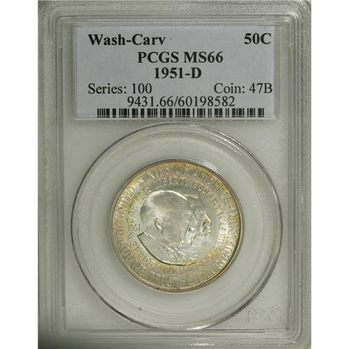 <B>1951-D 50C Washington-Carver MS66 PCGS.</B></I> Iridescent rings of violet, pink, blue, and yellow highlight the bright, lustrous surfaces. Suitably struck, and the reverse field has only a few faint grazes. Population: 41 in 66, 0 finer (1/07).<BR><BR><b>Shipping:</b> Coins & Currency (<a target="_blank" href="http://www.heritageauctions.com/common/shipping.php">view shipping information</a>)