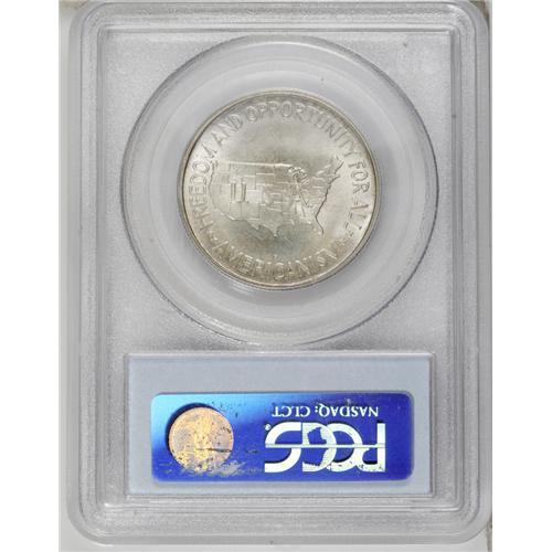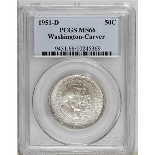 <B>1951-D 50C Washington-Carver MS66 PCGS.</B></I> Light almond-gold and powder-blue contributes to the eye appeal of this satiny Premium Gem. Well struck for this low relief type. Population: 37 in 66, 0 finer (10/06).<BR><BR><b>Shipping:</b> Coin/Currency (<a target="_blank" href="http://www.heritageauctions.com/common/shipping.php">view shipping information</a>)