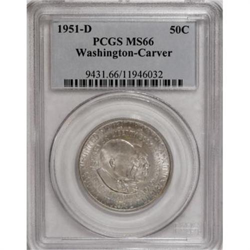 <B>1951-D 50C Washington-Carver MS66 PCGS.</B></I> Barely discernible whispers of powder-blue and gold adhere to the lustrous surfaces of this Premium Gem commemorative. A well executed strike leaves sharp definition on the motifs, and both sides are quite well preserved. Population: 51 in 66, 0 finer (1/08).<BR><BR><b>Shipping:</b> Coins & Currency (<a target="_blank" href="http://www.heritageauctions.com/common/shipping.php">view shipping information</a>)