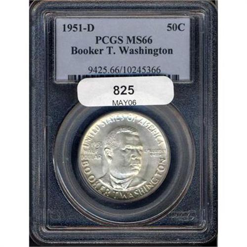 <b>1951-D Booker T. Washington Half Dollar. PCGS graded MS66.</b> Low mintage date: 7,000 pieces. Yet most have either been dipped or suffer uninspiring dull toning. Not so with this beautiful brilliant example <b>(PCGS # 9425)</b> <i>