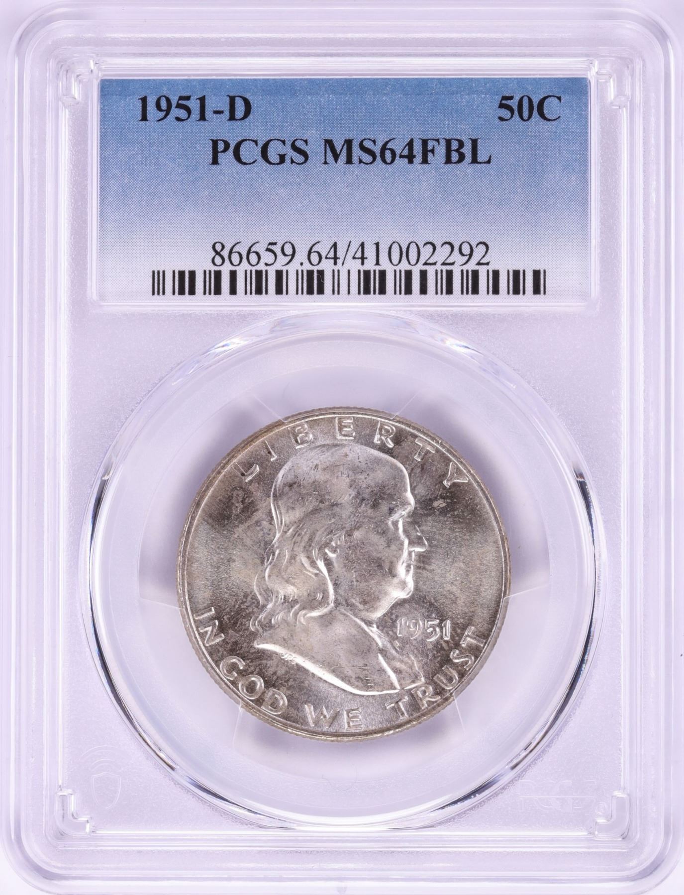 One 1951-D Franklin Half Dollar Coin PCGS MS64FBL.