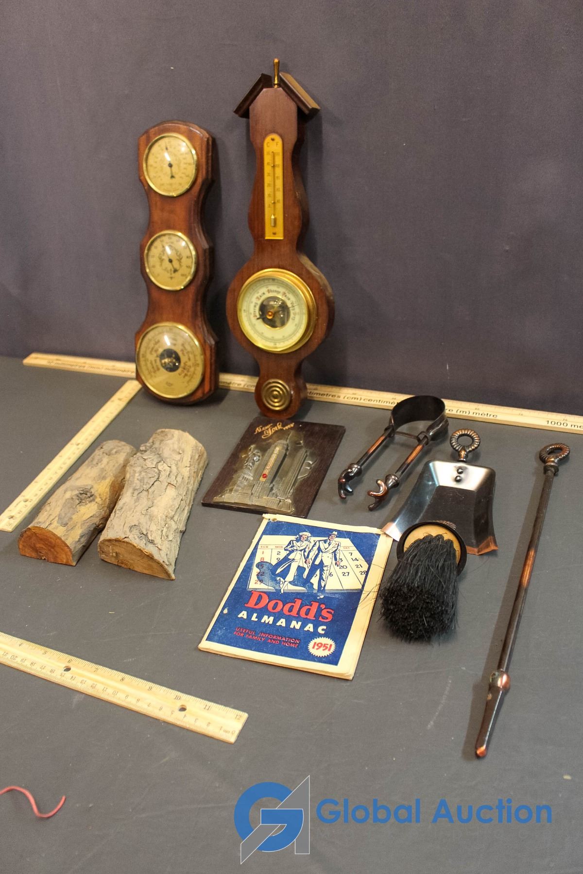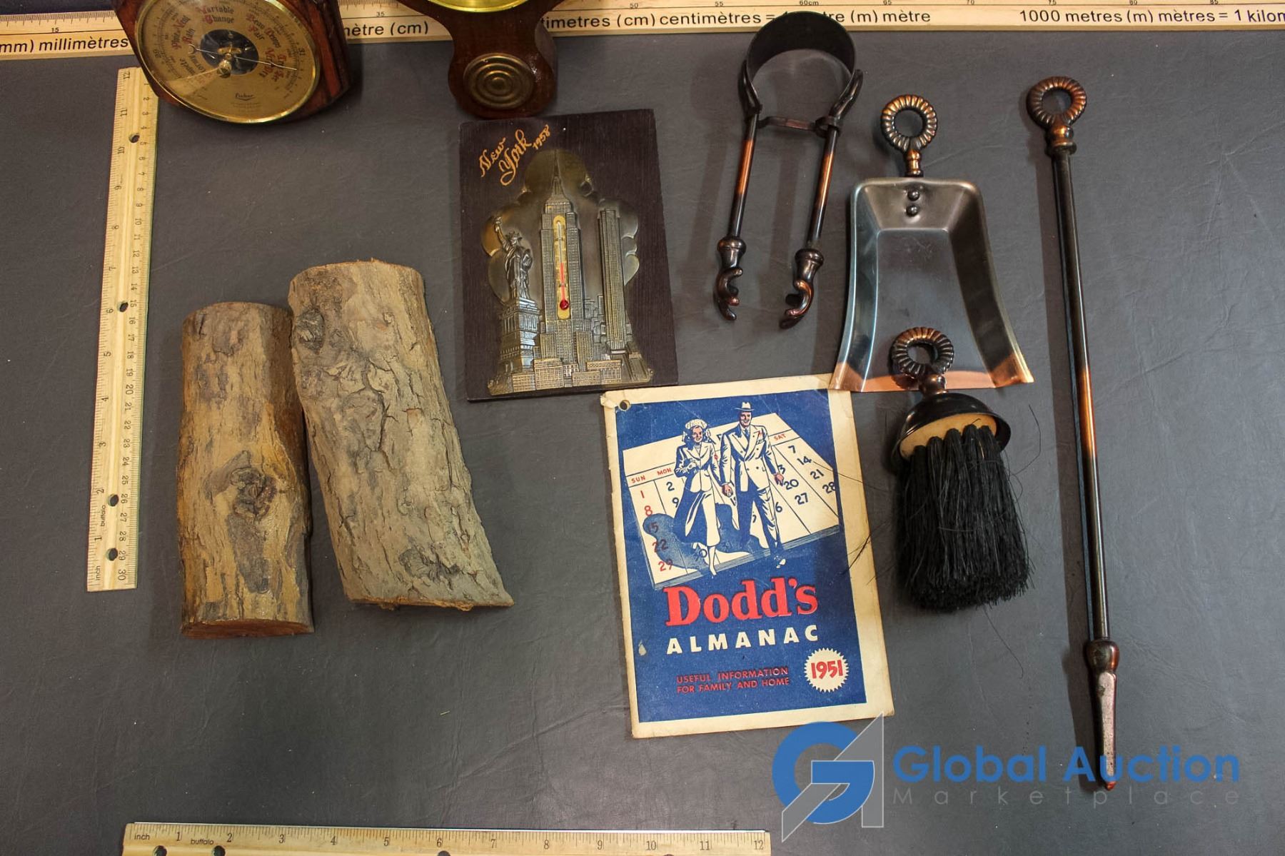 1951 Dodd's Almanac; Barometers (2), Thermometer; Decorative Fireplace Set