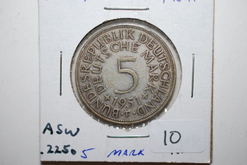 1951-F German 5 Deutsche Mark Foreign Coin; .2250 ASW; EST. $10-20