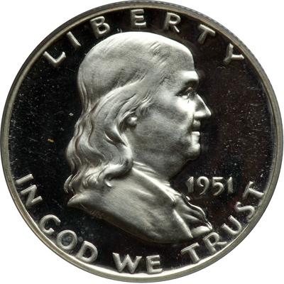 1951 Franklin Half Dollar. PCGS graded Proof 65 Deep Cameo. Totally white. Pop 8; 13 in 66, 1 in 67 (PCGS # 96692) .