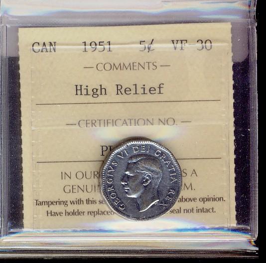 1951 High Relief 5¢ ICCS VF30, a nice problem free example.