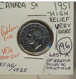 1951 High Relief 5¢ VF30, a nice problem free example.