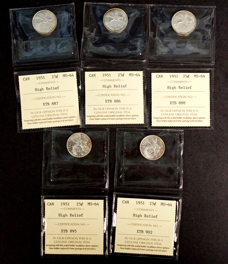 1951, High Relief, graded by ICCS Mintstate-64. Lot of 5 original coins.