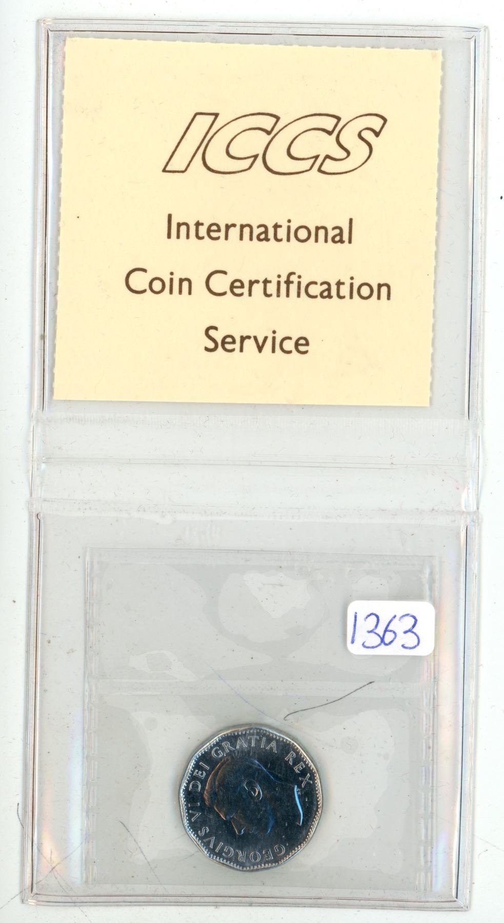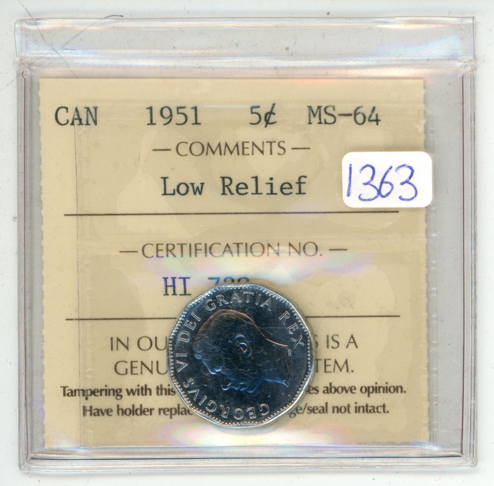 1951 ICCS graded, Canadian 5 cent coin - MS64