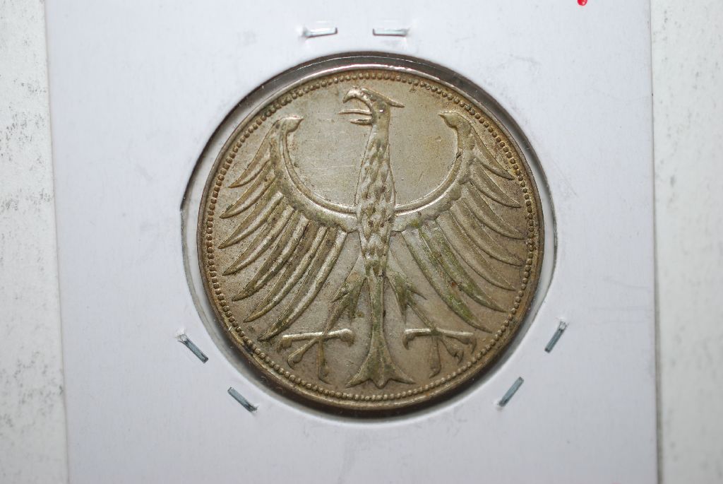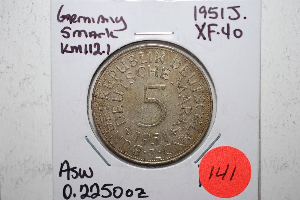 1951-J German 5 Deutsche Mark Foreign Coin; XF40; 0.2250 ASW; EST. $10-20