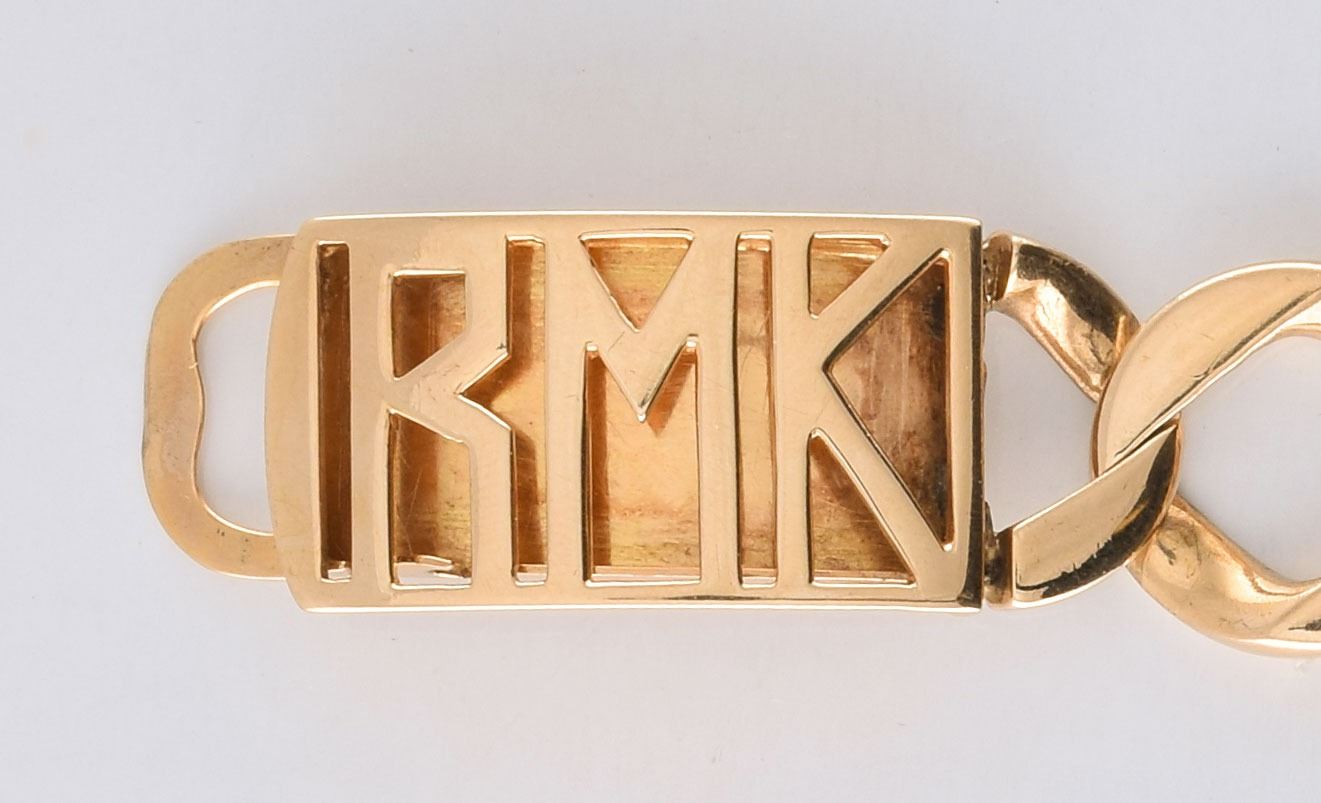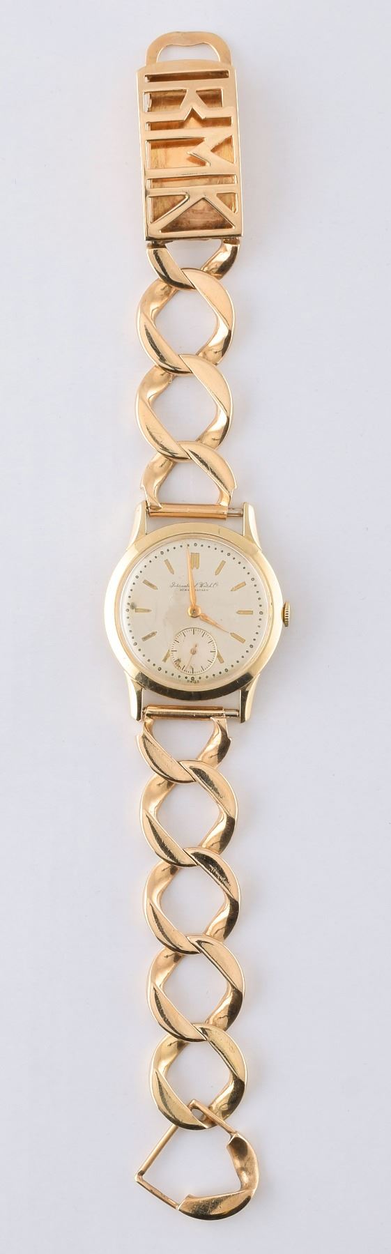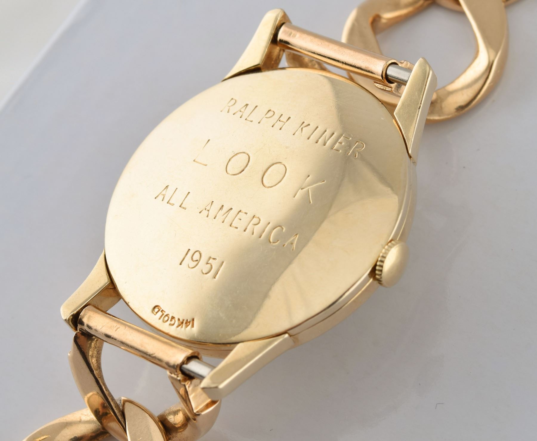In 1951 Ralph Kiner again led the National League in home runs with 42, the sixth consecutive year he led the league in that category. He also led the league in slugging at .627, runs score with 124, and as further proof Kiner was the most feared hitter in the league, leading the league in walks with 137. LOOK magazine selected Kiner to its yearly All-America team and presented him with this exquisite solid 14K gold wrist watch. Produced by Schaffhousen, renowned Swiss watch maker, the watch continues to be in working order. Ignoring the significant baseball aspect, the watch itself has its own collectible history that dates to 1868. Kiner obviously appreciated this time piece and wore it often as he had a solid gold band custom-made specially for his own everyday use, and bearing his large initials "RMK" at the clasp. More than an ounce of solid gold is offered here. The reverse is period engraved, "Ralph Kiner LOOK All -America 1951." Full LOA from University Archives (John Reznikoff), cert. #11071.
