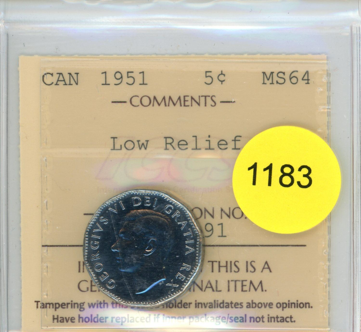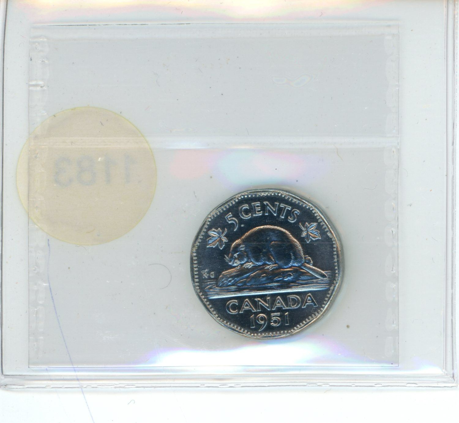 1951 Low Relief MS64 ICCS Graded Canadian Five Cent Coin