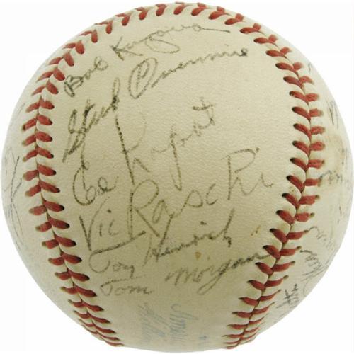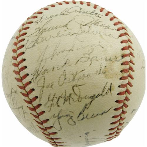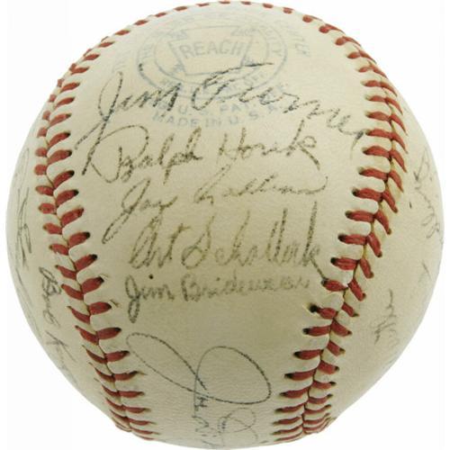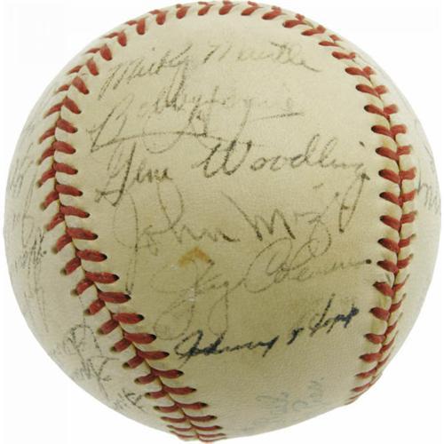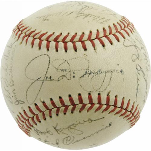 <B>1951 New York Yankees Team Signed Baseball.</B></I> The rapturous joy felt by Giants fans in the wake of Bobby Thomson's famous "Shot" was short-lived due to the twenty-six gentlemen whose signatures appear on this OAL (Harridge) ball. The Yanks were unstoppable this October, even despite the fact that their rookie right fielder, a kid named Mickey Mantle, was lost to an injury that would plague him the rest of his Hall of Fame career in the Series' second game. His supremely desirable rookie signature is ideally placed at the top of the panel directly above the sweet spot autograph of the man whose throne he was destined to assume, the departing legend Joe DiMaggio. Those with even a passing knowledge of Yankees history are aware that 1951 represents the only season these definitive Yankees shared a dugout, making this arguably the most desirable of post-war team balls. This fine example rates a steady and conservative 7/10 in signature quality, with not a single autograph venturing more than a point in one direction or the other. Joining Joe and Mickey are such stars as Berra, Mize, Henrich, Crosetti, Houk, McDougald, Bauer, Silvera, Raschi and Lopat. Heritage's May 2005 auction saw a top example of this team ball sell at $20,000. While this one isn't quite on the same level of perfection, it is surely one of the nicer examples you're likely to encounter in the hobby. <I>LOA from PSA/DNA.</B></I> <BR><BR><B>Important notice:</B> Heritage usually auctions material at the rate of 200-250 lots per hour. On some occasions eBay Live bid software or the Internet may not be able to keep up with the pace of the auction. We recommend placing a realistic absentee bid now as insurance to avoid disappointment. Occasionally the auctioneer may eliminate or reject an eBay Live bid, and the auctioneer may also reopen a lot after the close of the eBay live bidding (usually because we missed an audience bid), and may reject your bid even if it shows you as the winning bidder. By bidding via eBay Live, you agree that Heritage may award the lot to another bidder at its sole discretion under the circumstances described above or any other reasonable circumstances. Since eBay bids are not shown to us until we open the lot on the floor, we treat those bids just like floor bids. In most cases the floor responds before the eBay bid is presented to us, due to Internet lag time, so for consistency we have made it a policy that floor bids are always considered first over tie eBay live bids. Also please note that all Heritage lots purchased through eBay Live carry a 22.5% Buyer's Premium. Please make sure you read the Terms and Conditions before you bid. This lot is being auctioned in conjunction with a live floor auction by Heritage Galleries & Auctioneers. All final auction and invoice information will be supplied by Heritage Galleries & Auctioneers, and all other information should be considered preliminary. Lot:19405 <BR><BR><B>Winning Notification and Billing:</B> After the FINAL session in this auction is complete, Heritage will send e-mail and snail mail invoices. This process normally takes several days. All final auction and invoice information will be supplied by Heritage Galleries & Auctioneers, and all other information should be considered preliminary. <BR><BR>This auction will be conducted on a live auction floor and over the Internet through eBay Live. If you choose to place an absentee bid, please take a moment to <font color='#0000ff'><u><a href='http://pages.ebay.com/liveauctions/help/before/laabsentee.html'>learn how eBay Live absentee bidding works</a></u></font><font color='#000000'>