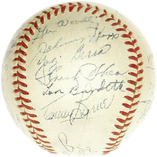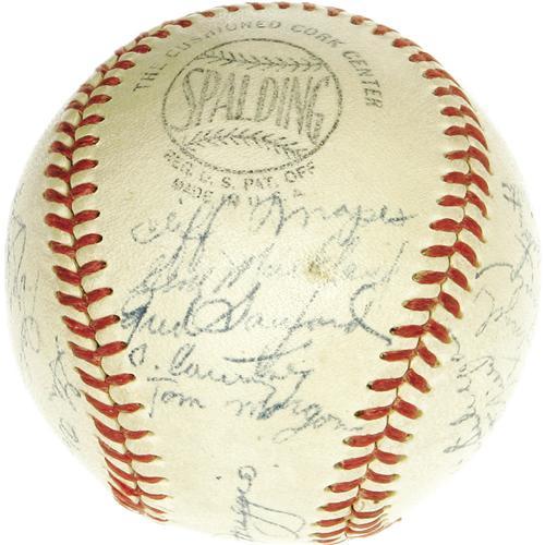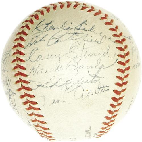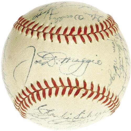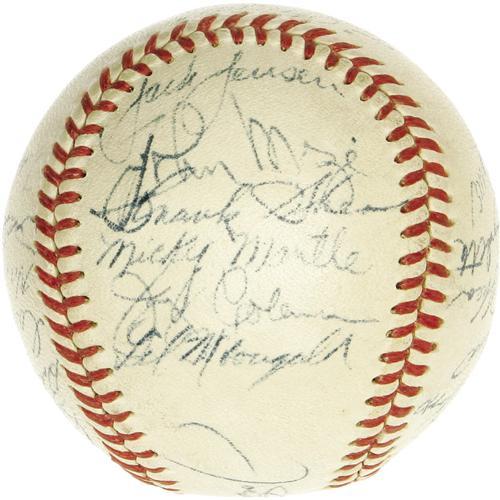 <B>1951 New York Yankees Team Signed Baseball.</B></I> Widely considered to be the most desirable of all post-war team balls are those featuring the 1951 Bronx Bombers, who earned the third of five consecutive World Championships under the new reign of Hall of Fame manager Casey Stengel. This pedigree is not entirely the reason for the elite status in the hobby, however. True Yankee fans will know that this season represented the only one that saw Joe DiMaggio and Mickey Mantle share an outfield. Each is present and accounted for on this Official Texas League ball along with nineteen fellow Yanks, including Stengel (rare on team balls!), Berra, Rizzuto, Mize, Coleman, Woodling, Bauer and more. Three unrelated signatures are here as well, not included in the count. Signature quality ranges from 7/10 to 9/10, and the ball itself exhibits a clean and creamy tone. Definitely a top shelf example from this historic convergence of baseball icons. <I>LOA from PSA/DNA. LOA from James Spence Authentication.</B></I><BR><BR><b>Shipping:</b> Balls, Pucks, etc., Small (<a target="_blank" href="http://www.heritageauctions.com/common/shipping.php">view shipping information</a>)
