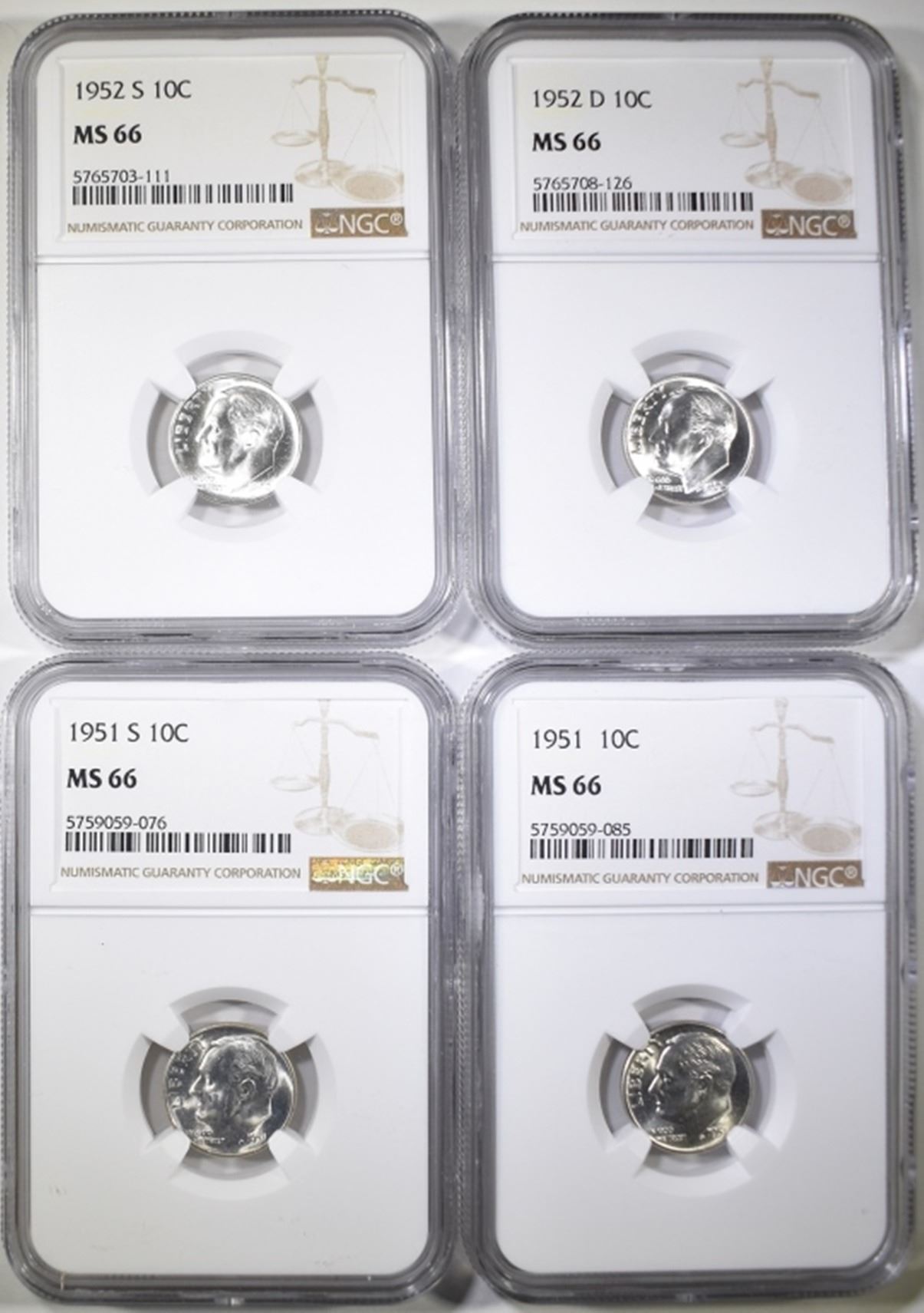 1951-P&S, 52-D&S ROOSEVELT DIMES, NGC MS-66