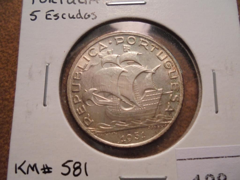 1951 PORTUGAL SILVER 5 ESCUDOS UNC