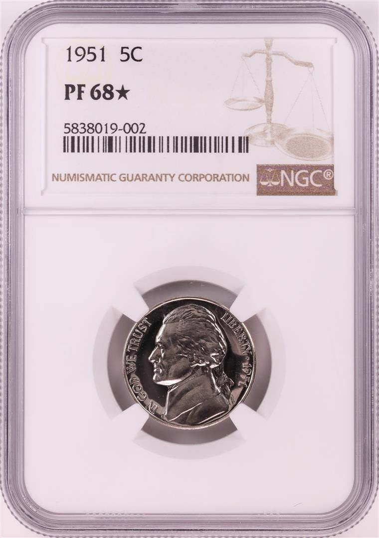 One 1951 Proof Jefferson Nickel Coin NGC PF68* STAR. NGC Certified.
