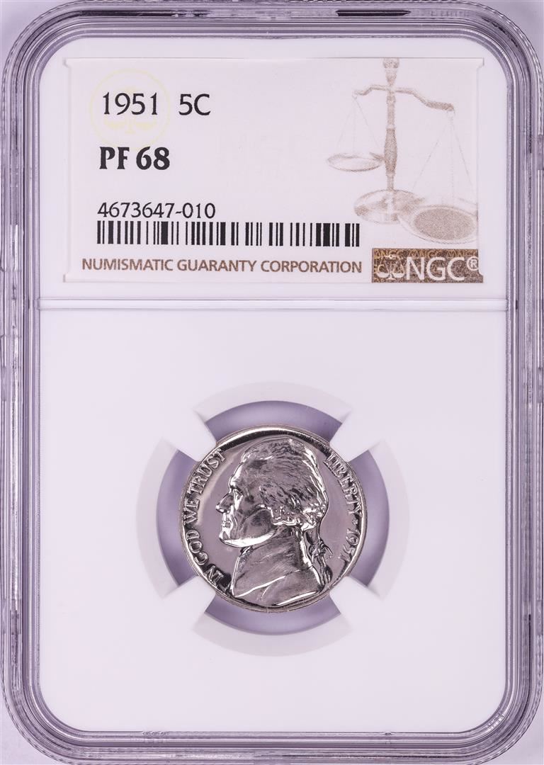 One 1951 Proof Jefferson Nickel Coin NGC PF68. NGC Certified.
