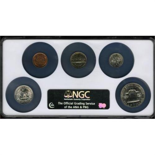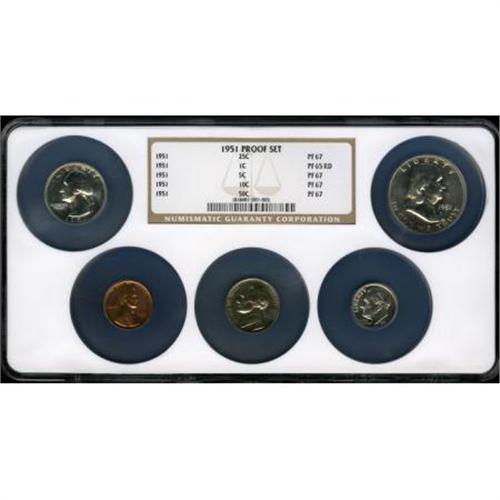 <B>1951 1C Proof Set PR65 to PR67 NGC.</B></I> The set includes: <B>cent PR65 Red,</B></I> a brick-red Gem with a few tiny orange freckles on the lower left obverse; <B>nickel PR67,</B></I> delicate ice-blue and almond-gold toning, exactingly struck; <B>dime PR67,</B></I> lightly toned and lovely; <B>quarter PR67,</B></I> russet and apple-green visit the borders; and a <B>half dollar PR67,</B></I> golden-brown and aquamarine peripheral toning, satin luster.<BR><BR><B>Coin Engraver:</B> Victor D. Brenner<BR><BR><b>Shipping:</b> Coins & Currency (<a target="_blank" href="http://www.heritageauctions.com/common/shipping.php">view shipping information</a>)