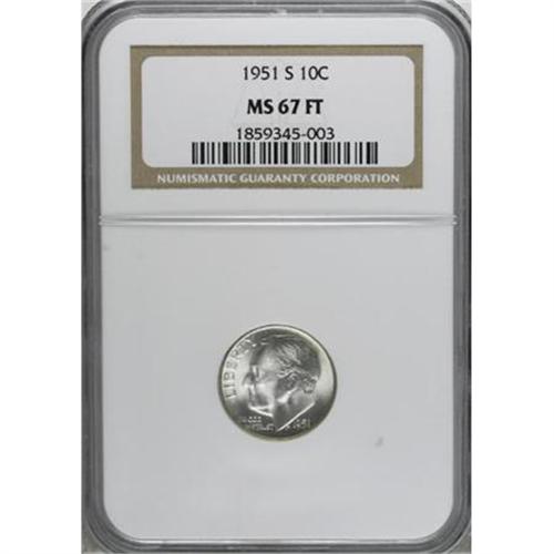 <B>1951-S 10C MS67 Full Bands NGC.</B></I> NGC Census: (0/0). PCGS Population (33/5). Mintage: 31,630,000. (#85099)<BR><BR><B>Coin Engraver:</B> John R. Sinnock<BR><BR><b>Shipping:</b> Coins & Currency (<a target="_blank" href="http://www.heritageauctions.com/common/shipping.php">view shipping information</a>)