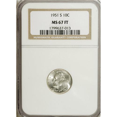 <B>1951-S 10C MS67 Full Bands NGC.</B></I> NGC Census: (0/0). PCGS Population (32/5). Mintage: 31,630,000. (#85099)<BR><BR><b>Shipping:</b> Coins & Currency (<a target="_blank" href="http://www.heritageauctions.com/common/shipping.php">view shipping information</a>)