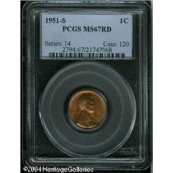 1951-S 1C MS67 Red PCGS. Vivid peach color dominat <B>1951-S 1C MS67 Red PCGS.</B></I> Vivid peach color dominates this lovingly preserved and nicely struck Superb Gem, although glimpses of lime color are also evident. Population: 43 in 67, none finer (11/04). <BR><BR><B>Important notice:</B> Heritage usually auctions material at the rate of 200-250 lots per hour. On some occasions eBay Live bid software or the Internet may not be able to keep up with the pace of the auction. We recommend placing a realistic absentee bid now as insurance to avoid disappointment. Occasionally the auctioneer may eliminate or reject an eBay Live bid, and the auctioneer may also reopen a lot after the close of the eBay live bidding (usually because we missed an audience bid), and may reject your bid even if it shows you as the winning bidder. By bidding via eBay Live, you agree that Heritage may award the lot to another bidder at its sole discretion under the circumstances described above or any other reasonable circumstances. Since eBay bids are not shown to us until we open the lot on the floor, we treat those bids just like floor bids. In most cases the floor responds before the eBay bid is presented to us, due to Internet lag time, so for consistency we have made it a policy that floor bids are always considered first over tie eBay live bids. Also please note that all Heritage lots purchased through eBay Live carry a 20% Buyer's Premium. Please make sure you read the Terms and Conditions before you bid. This lot is being auctioned in conjunction with a live floor auction by Heritage Galleries & Auctioneers. All final auction and invoice information will be supplied by Heritage Galleries & Auctioneers, and all other information should be considered preliminary. Lot:5377