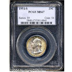 <B>1951-S<25C> MS67 PCGS.</B></I> Colorful multicolored iridescence has accumulated on each side. This coin probably spent many years in a mint set holder. Well defined and essentially mark-free overall. <BR><BR><B>Important notice:</B> Heritage usually auctions material at the rate of 200-250 lots per hour. On some occasions eBay Live bid software or the Internet may not be able to keep up with the pace of the auction. We recommend placing a realistic absentee bid now as insurance to avoid disappointment. Occasionally the auctioneer may eliminate or reject an eBay Live bid, and the auctioneer may also reopen a lot after the close of the eBay live bidding (usually because we missed an audience bid), and may reject your bid even if it shows you as the winning bidder. By bidding via eBay Live, you agree that Heritage may award the lot to another bidder at its sole discretion under the circumstances described above or any other reasonable circumstances. Since eBay bids are not shown to us until we open the lot on the floor, we treat those bids just like floor bids. In most cases the floor responds before the eBay bid is presented to us, due to Internet lag time, so for consistency we have made it a policy that floor bids are always considered first over tie eBay live bids. Also please note that all Heritage lots purchased through eBay Live carry a 20% Buyer's Premium. Please make sure you read the Terms and Conditions before you bid.