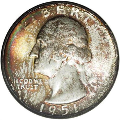 <B>1951-S<25C> MS68 NGC.</B></I> The 1951-S quarter is downright rare in the lofty grade of MS68. To date, NGC and PCGS have certified a total of eight examples in this level of preservation, and none finer. This specimen displays dazzling luster and spectacular toning. The obverse shows waves of forest-green, lavender, crimson, and orange-gold coloration in the left (facing) obverse field, replaced by dappled orange and lavender in the remaining areas of this side. The reverse contains deep, mottled olive-green, lavender, and gold patination. The design elements are well impressed, and near-pristine surfaces are devoid of significant abrasions. Census: 7 in 68, 0 finer (1/06).<BR><I>From The Houston Collection of Washington Quarters.</B></I>