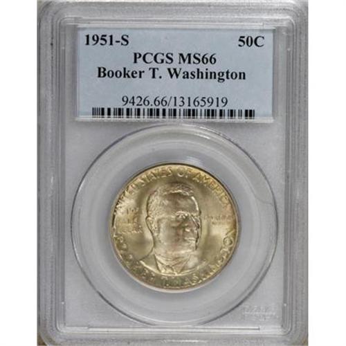 <B>1951-S 50C Booker T. Washington MS66 PCGS.</B></I> PCGS Population (280/18). NGC Census: (227/43). Mintage: 7,004. Numismedia Wsl. Price for NGC/PCGS coin in MS66: $180. (#9426)<BR><BR><b>Shipping:</b> Coins & Currency (<a target="_blank" href="http://www.heritageauctions.com/common/shipping.php">view shipping information</a>)