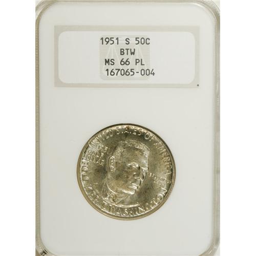 <B>1951-S 50C Booker T. Washington MS66 Prooflike NGC.</B></I> A modestly reflective representative of this last-year issue, one of just 7,004 examples coined. Well struck with light golden haze. Census: 13 in 66 Prooflike, 13 finer (1/07).<BR><BR><b>Shipping:</b> Coins & Currency (<a target="_blank" href="http://www.heritageauctions.com/common/shipping.php">view shipping information</a>)