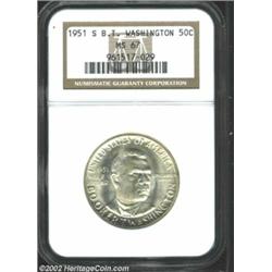 1951-S 50C Booker T. Washington MS67 NGC. A lustrous Gem that is sharply struck for the type. The surfaces are tantalizingly close to fully pristine. 1951 was the final year of the Booker T. Washington Commemoratives, although his run on the Washington-Carver type also began that year. Just 7,004 pieces were struck. Population: 14 in 67, 0 finer (11/02). Important notice: We expect to be auctioning lots at the rate of 200-250 per hour. Sometimes eBay Premier live bid software cannot keep up with that pace, so we strongly recommend that you place a realistic proxy bid now as insurance to avoid disappointment. Also please note that all Heritage/CAA lots purchased through eBay Premier carry a 20% Buyer's Premium. Please make sure you read the Terms and Conditions.