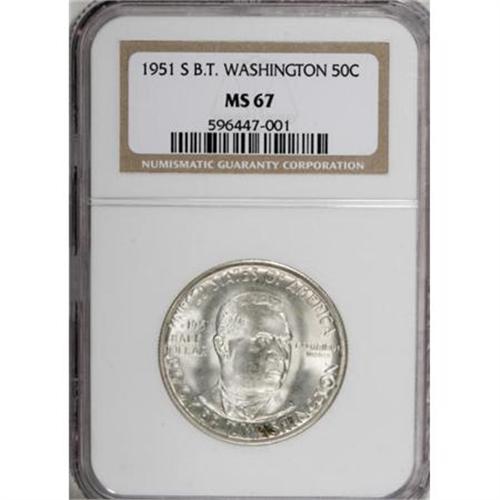 <B>1951-S 50C Booker T. Washington MS67 NGC.</B></I> The series-ending S-mint Booker T. Washington issue, represented here by a strongly lustrous and solidly struck example, silver-white with areas of luminous tan. Neither NGC nor PCGS has graded a numerically superior representative (9/07).<BR><BR><b>Shipping:</b> Coins & Currency (<a target="_blank" href="http://www.heritageauctions.com/common/shipping.php">view shipping information</a>)
