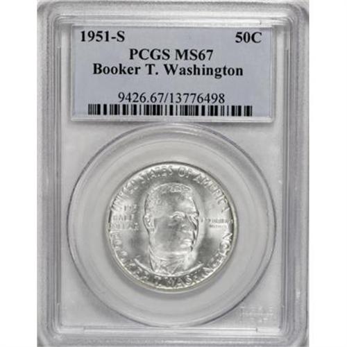 <B>1951-S 50C Booker T. Washington MS67 PCGS.</B></I> Brilliant throughout, this lovely coin displays bright, frosted mint luster and nearly abrasion-free surfaces. Very scarce as such. Census: 43 in 67, 0 finer (8/07).<BR><BR><b>Shipping:</b> Coins & Currency (<a target="_blank" href="http://www.heritageauctions.com/common/shipping.php">view shipping information</a>)