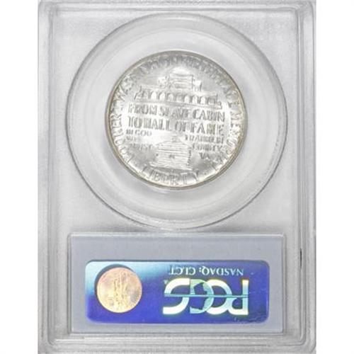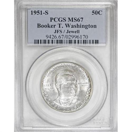 <B>1951-S 50C Booker T. Washington MS67 PCGS.</B></I> Ex: JFS / Jewell. Solidly struck for the issue with shining luster beneath delicate blue and violet shadings. Excellent preservation overall, though a few flaws from the planchet remain on Washington's cheek. Tied for the finest certified by NGC or PCGS (12/07).<BR><BR><b>Shipping:</b> Coins & Currency (<a target="_blank" href="http://www.heritageauctions.com/common/shipping.php">view shipping information</a>)
